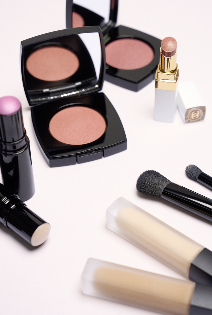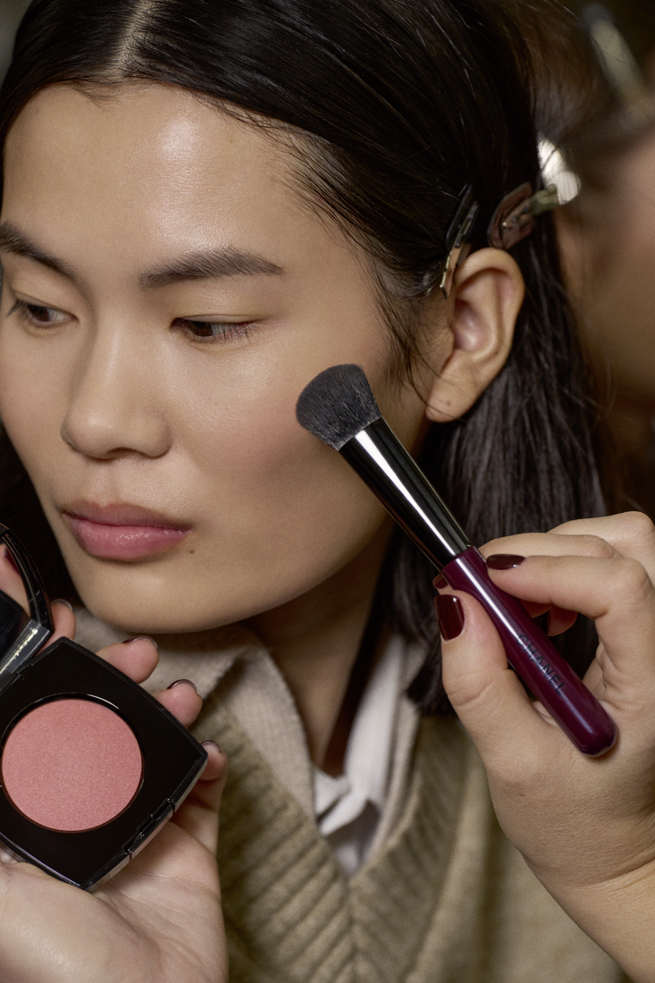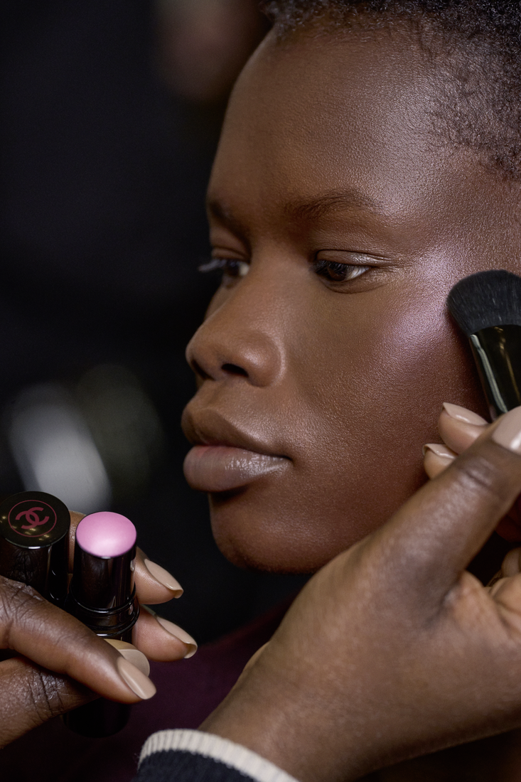 O blush foi a estrela do visual, tendo sido usado o Joues Contraste Intense, nos tons Rose Radiant ou Beige Éclatant, no centro da maçã do rosto. Com um pincel ou a ponta dos dedos, foi aplicado o Baume Essentiel Rouge Noir, no tom Cute ou o Baume Essentiel, no tom Sculpting, com leves toques na mesma região para uma luminosidade natural. Este segundo, foi também aplicado na pálpebra.