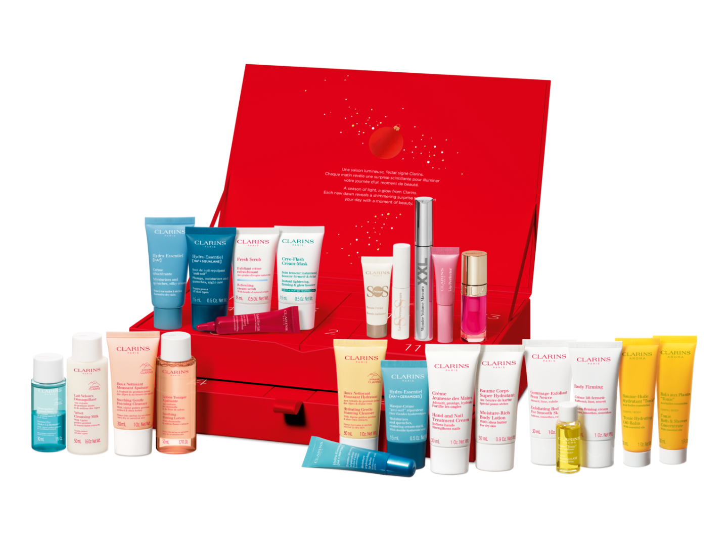 Nestes calendários encontrará tamanhos de venda, formato trial e travel sizes. Destacam-se alguns produtos famosos da Clarins, como o Lip Comfort Oil, o SOS Primer, o icónico Baume Beauté Eclair e o Total Eye Lift e ainda essenciais Hydra Essentiel.